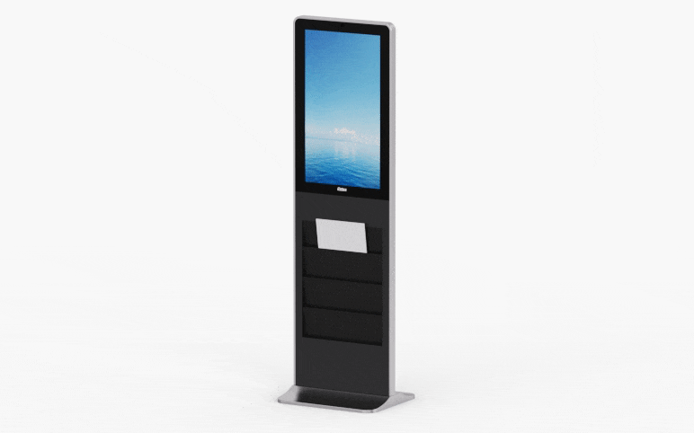 This is a kiosk with brochure holders, available in two display modes, 22 inch portrait screen/32 inch landscape screen, default brightness 500 nits (optional up to 3500 nits), optional capacitive touch or IR touch. The kiosk can provide “hybrid advertising” showing mode, i.e. paper static + electronic dynamic, to meet various reading and display needs, especially suitable for financial institutions, government agencies, shopping halls, reception areas, lobbies, exhibitions, etc.