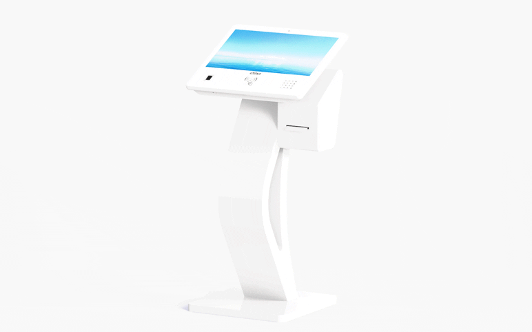 Unique “K” shaped design stand, ultra-thin case surrounded by silver aluminum frame, made of strong and durable metal material, surface sprayed with RC-1162 white using advanced modern technology, elegant and exquisite; capacitive interactive screen, equipped with thermal printer, fingerprint reader, RFID card reader, numeric keyboard and camera can provide customers with various services such as self-ordering, self-checkout, self-enquiry and business processing.