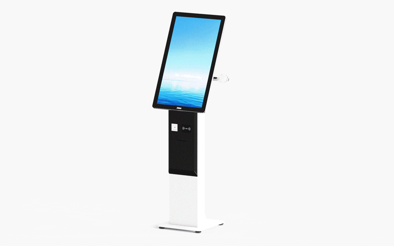 Capacitive touch screen, 500 nit brightness, commercial grade design allows digital signage displays run 24×7 smoothly; white metal casing, black tempered glass, silver aluminum frame, modern and simple design, both sturdy and durable; With QR scanner, RFID card reader, ticket printer, POS machine, supporting multiple payment methods, ideal choice for self-ordering and self-checkhout.