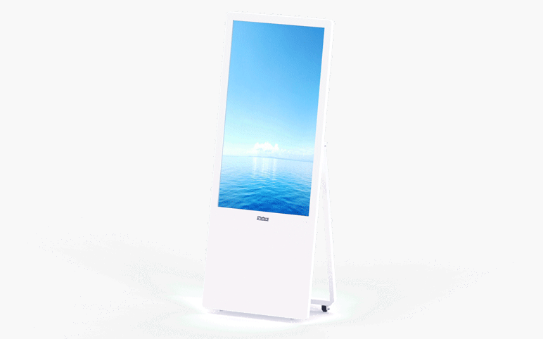 38 mm ultra-slim screen, exquisite and lightweight; Foldable stand with rollers for easier movement; Optional black/white metal shell, both surrounded by silver aliminum frame; Android/Windows/Monito/Plug-and-Play OS, CMS can be added for free and third-party software can be installed and run; 1080×1920 FHD display, 500-3500 nits brightness optional (default 500 nits), providing immersive picture quality indoors.